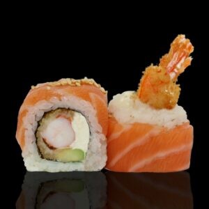 Lõhe, hiidkrevett tempura, kreemjuust, avokaado