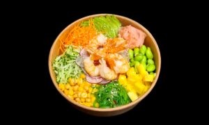 Hiidkrevett, sushi riis, avokaado, kurk, porgand, redis, magus mais, wakame salat, edamame oad, mango, ingver, seesamiseemned, kaste
