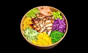 Угорь, cуши рис, авокадо, огурец, сладкая кукуруза, вакаме салат, фасоль edamame, манго, красная капуста, японский омлет, имбирь, кунжут, соус
